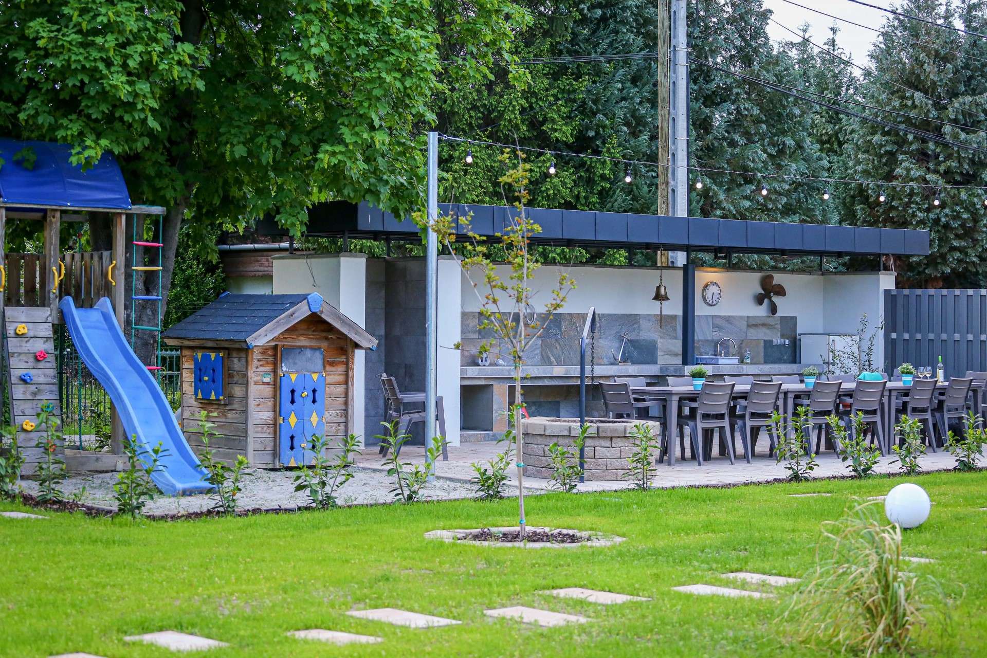 Az udvaron a gyermekek számára játszótér található, míg a teraszon kényelmes székek, asztalok és napágyak várják a vendégeket. A hátsó kertben kerti zuhany is rendelkezésre áll.